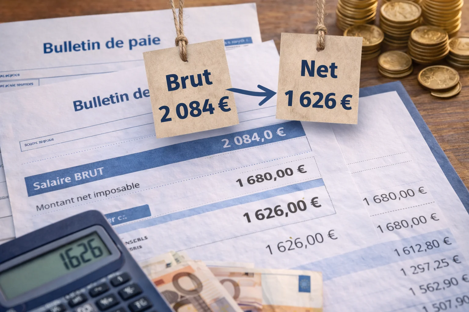 Si votre bulletin indique 2 084 € brut et que vous constatez un écart important avec les 1 626 € estimés, vérifiez les lignes de cotisations complémentaires (mutuelle, prévoyance, épargne salariale) qui expliquent généralement la différence.